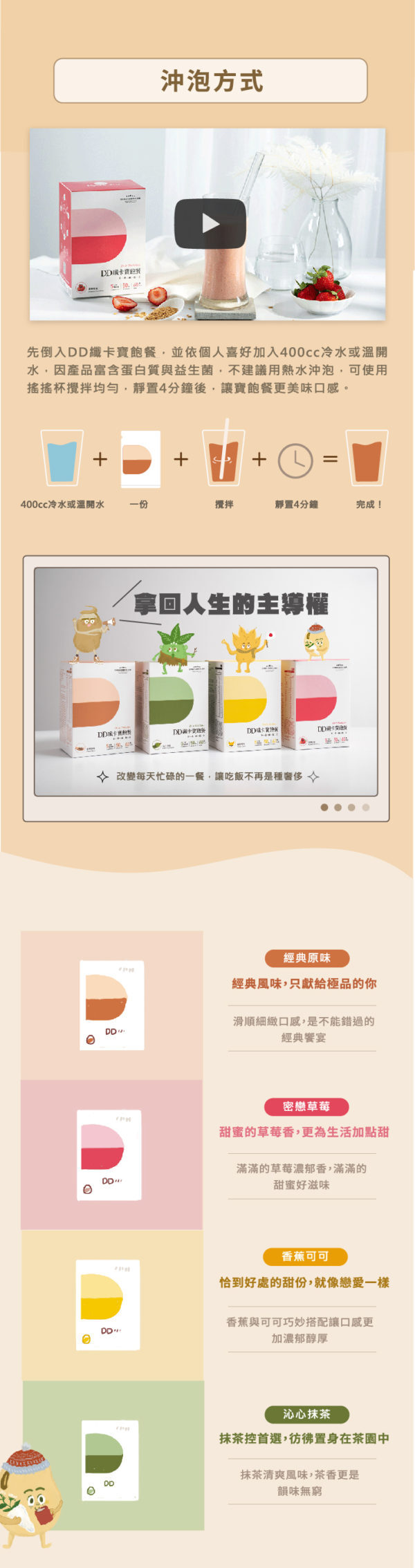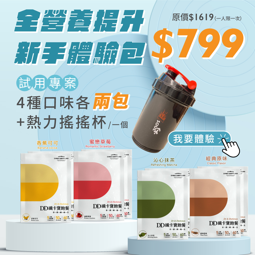 ● 試用產品:DD纖卡寶飽餐-新手體驗包(經典原味、蜜戀草莓、沁心抹茶、香蕉可可,四種口味各2包/盒 + 熱力搖搖杯乙個),價值$799元
