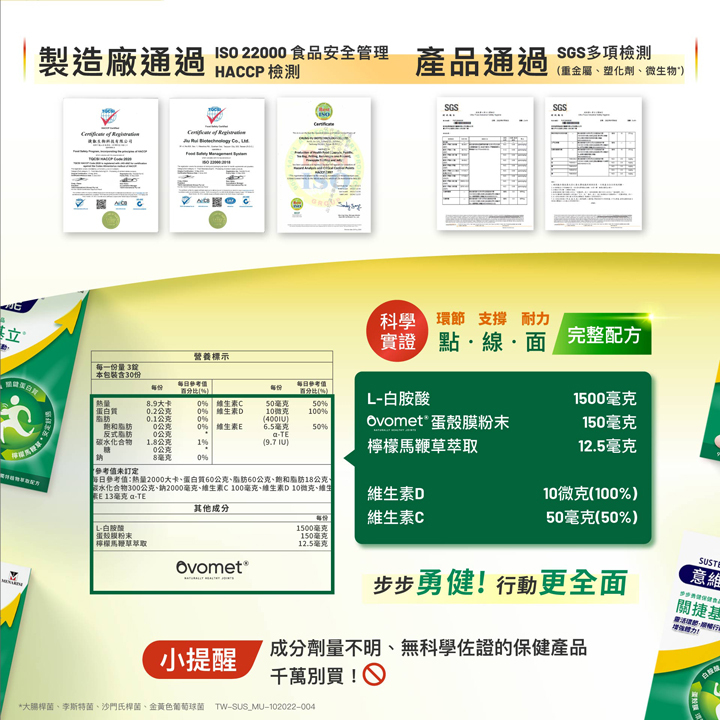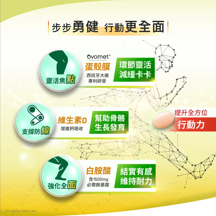 2.請在文章中帶入產品特色,可參考文案或官網內容但不要直接複製貼上喔(例如:添加白胺酸-強化耐力;專利Ovomet®蛋殼膜-加強環節靈活;維生素D-協助骨骼發育等)。