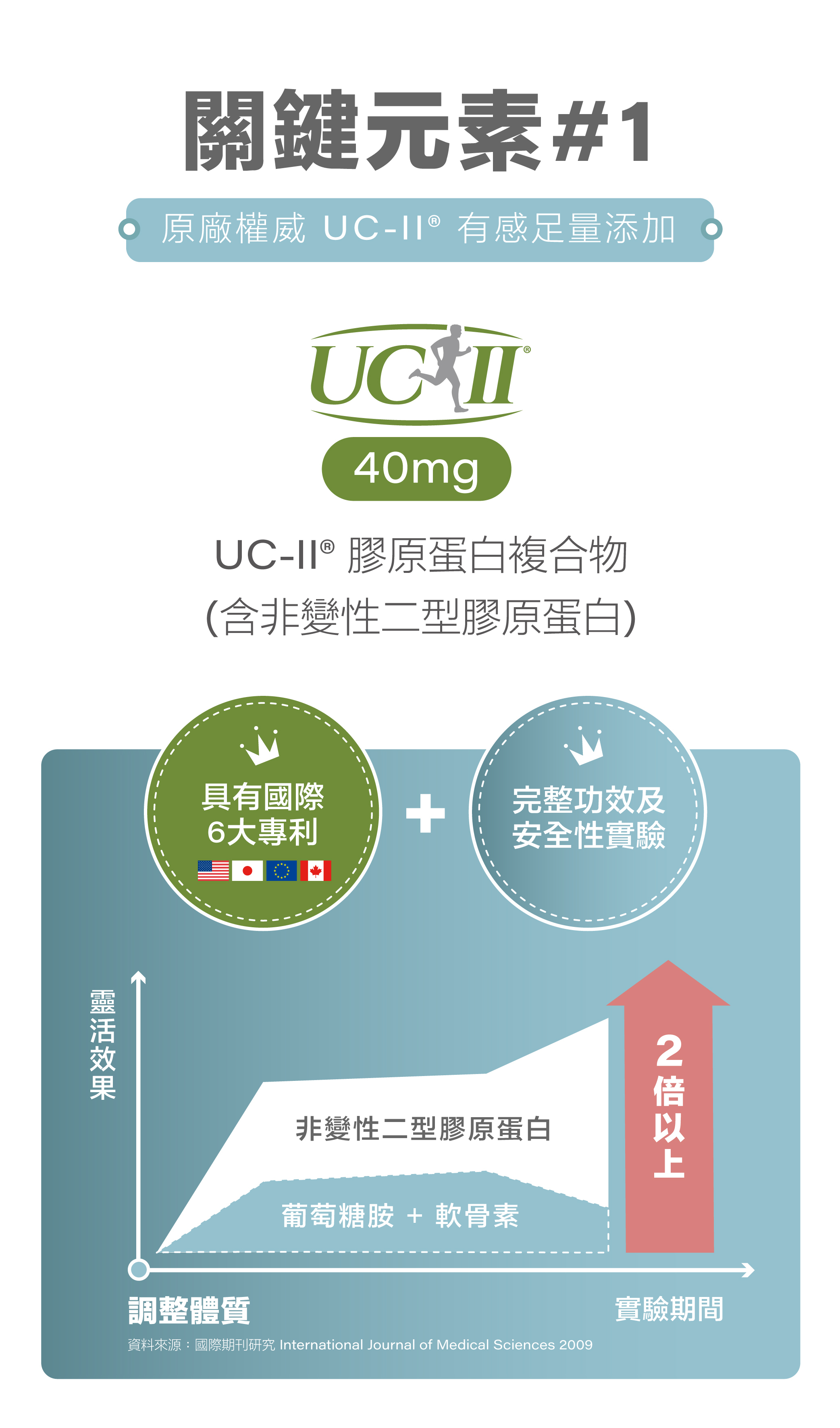 根據國際期刊的研究顯示,每日補充40mg UC-II,和補充葡糖糖胺1500mg+軟骨素1200mg相較,更勝一籌!👍👍