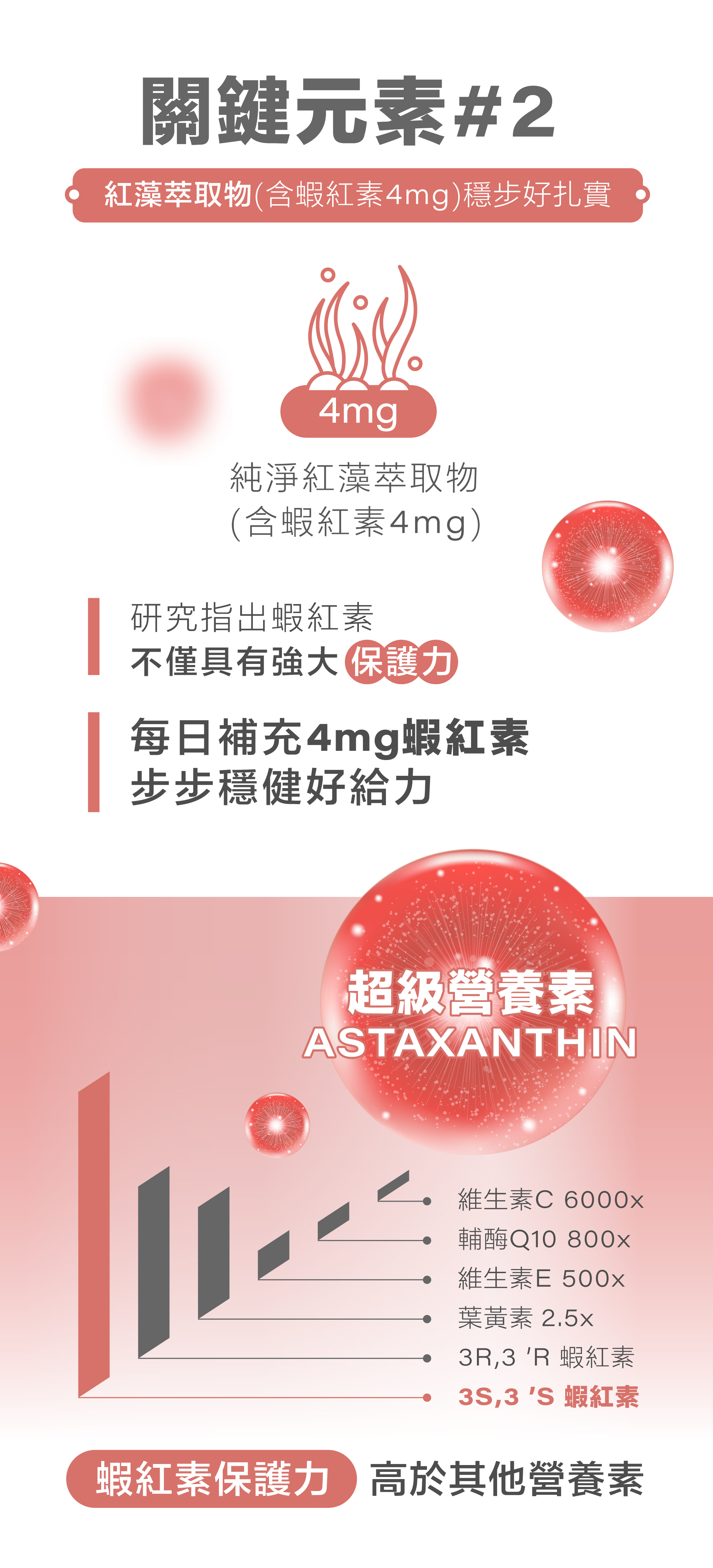 🟠4mg蝦紅素🦐:添加紅藻來源的蝦紅素,不僅可以調節生理機能,根據期刊顯示,每日補充4mg蝦紅素,行動靈活營養補給!