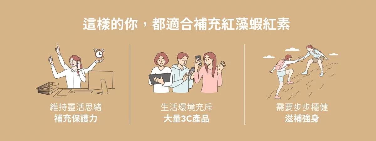 搭配調節生理機能的紅藻蝦紅素,以及葡萄糖胺、檸檬酸鈣,