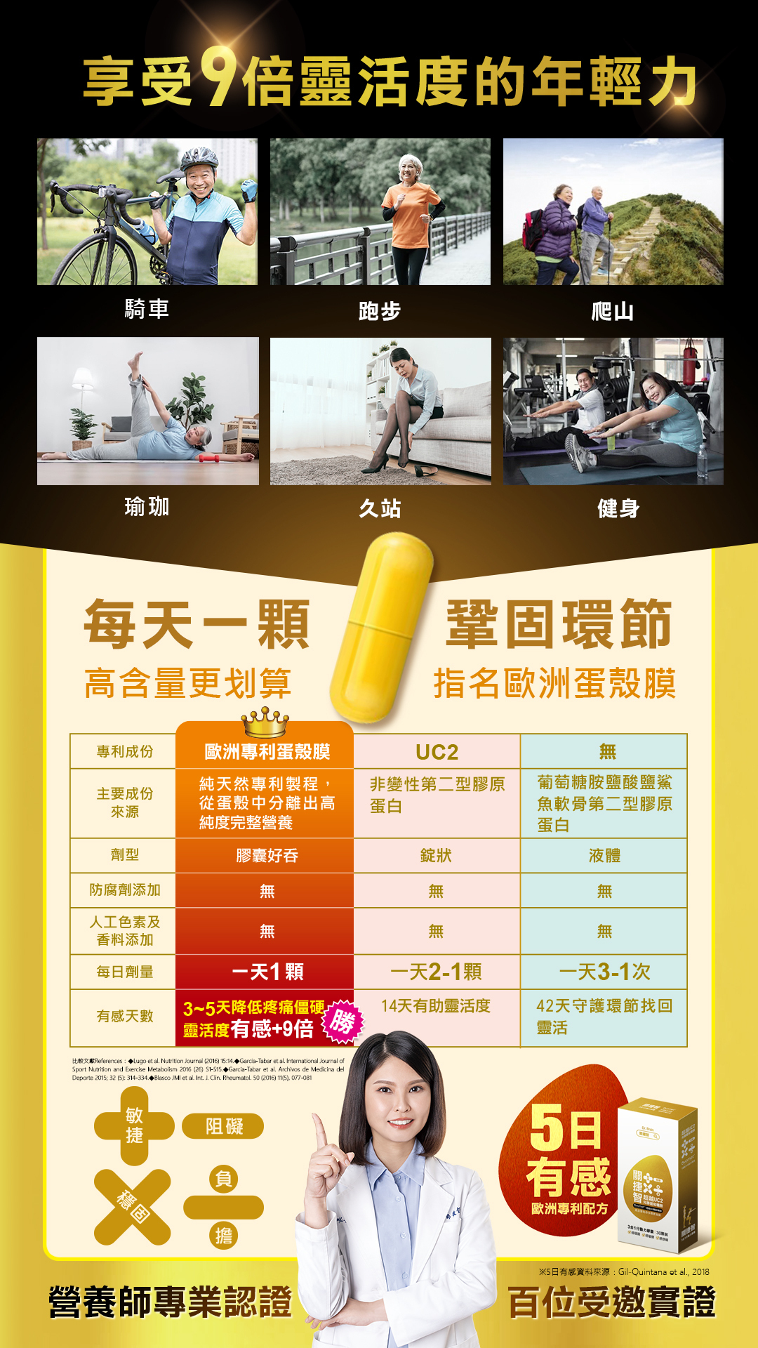 5. 歡迎發揮創意呈現出食用前後的差異,例如:爬山健走更靈活、運動補充提升行動力、變天引發的疼痛趨緩等。
